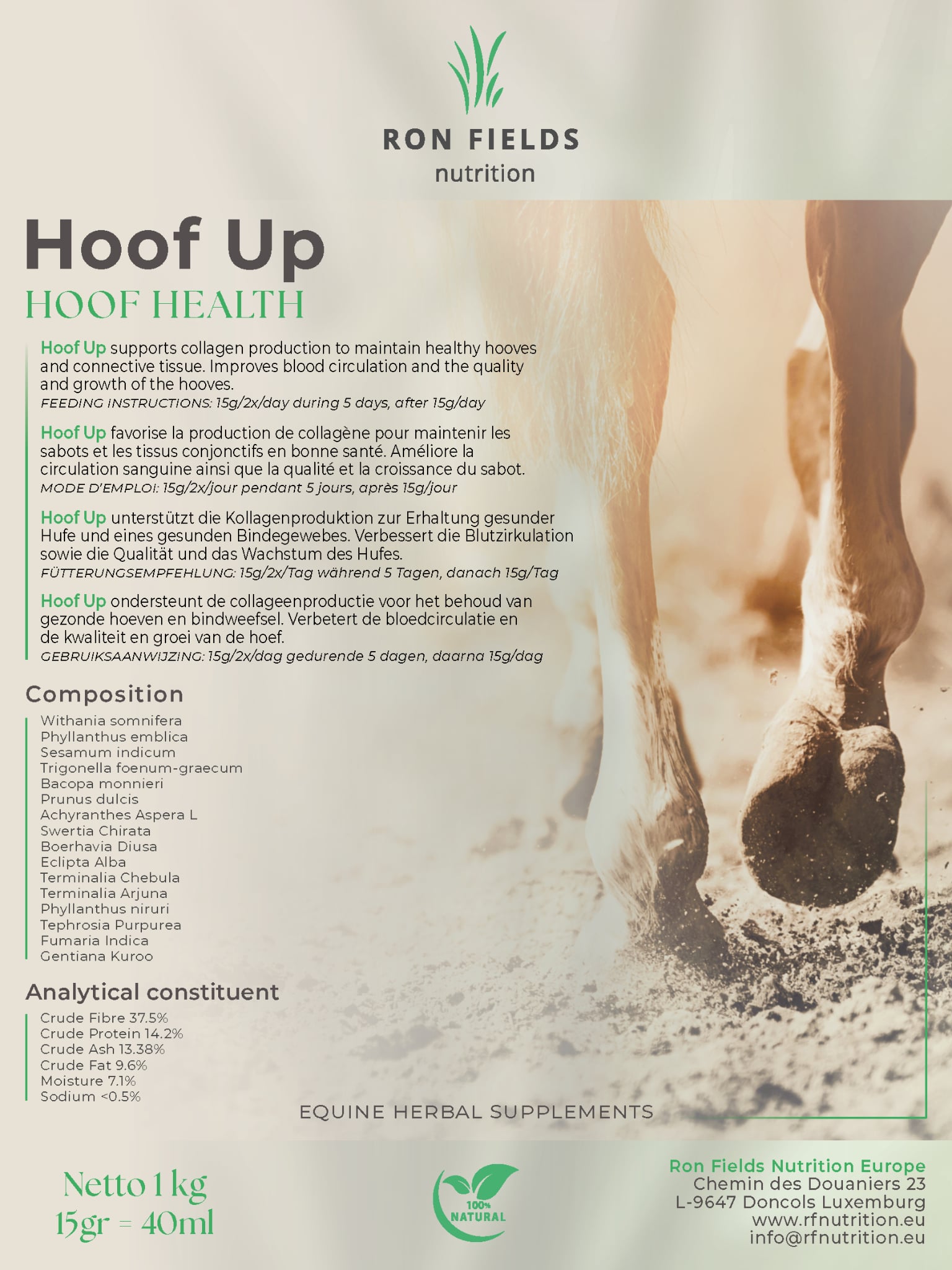 Hoof Up can be fed 15g twice per day for 5 days and 15g per day thereafter. It is recommended for use over a period of several months and can be given in a daily ration or in a mash.Hoof UP by Ron Fields Nutrition is a premium Ayurvedic supplement formulated to support strong, resilient, and healthy hooves in horses.